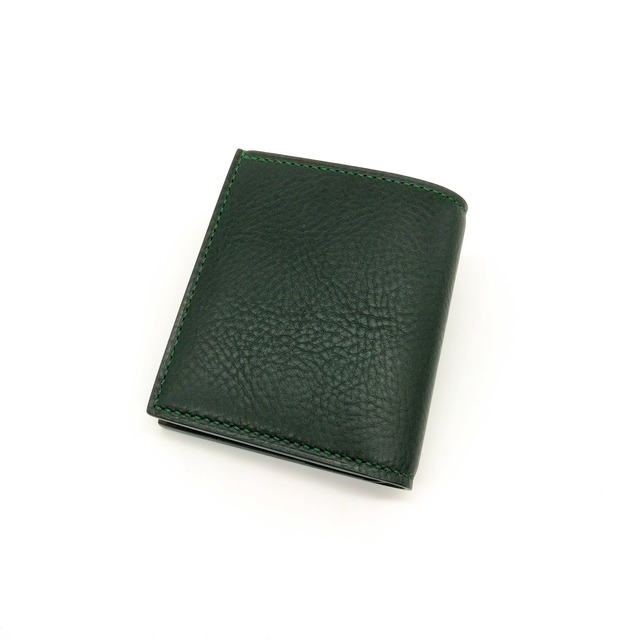 ●商品説明 コンパクトな小銭入れ無しの2つ折り財布です。 外側はイタリア産の牛革、内側は国産の牛革を組み合わせています。メインの札入れ部分は芯材無し裏革無しの仕様です。 開くと左右に2段のカードポケットがあります。 カードポケットは左右とも同じ作りで全体でカードを4枚収納できるようになっています。 札入れ部分は2か所です。 メインの札入れ部分に加えてカード入れの下の部分にお札を挟むように入れる形になります。 メインの札入れ部分は1万円札がぴったり入るサイズで通常の2つ折り財布よりコンパクトな設計になっています。 2つ折り財布としては比較的コンパクトで最低限のカード4枚とお札を持てる品となっています。 縫製は1針1針手縫いで縫製しています。 ●サイズ 縦10.2cm×横9cm×厚さ3㎝ (2つ折りにした状態) ●使用している革について イタリア産オイルレザー イタリアのトスカーナ地方、植物タンニン鞣しの生誕地と言われるサンタクローチェ地区にある老舗タンナーが製造するタンニン鞣しのオイルレザーです。鞣し後に通常の1.5~2倍のオイルをたっぷりと含ませた革で、しっとりとしたオイル感と深い色合いが特徴の革です。表面のシボは日本国内でつけたシボで、上品かつダイナミックな表情を楽しめます。使用しているうちにだんだんとオイル分が表面に出てきて、美しい艶感とより深みのある色合いに経年変化していきます。 国産牛革 国産の素上げ(表面加工をほとんど施さず、革素材そのものに近い仕上げ)の革です。当工房で手揉み(四方八方から革を手で揉みほぐしてシボをつけるやり方)をして、繊維をほぐしてシボをつけています。経年変化の速度はゆっくりですが、使っているうちに徐々に深みのある色合いに変化していき、渋味の増していく革です。 ●購入の際の注意点 使用している革は表面加工をあまりしていない薄化粧の革を使用しています。そのため小さな傷やシワ等が残っている場合があります。画像の写り具合やお使いのブラウザによって少し色味が違って見える場合があります。ご了承くださいませ。