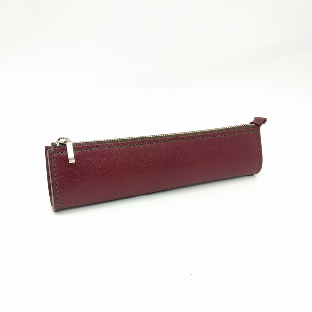 ●商品説明 マチがなく厚みのない作りですが、物を入れるとぷっくり膨らむペン入れです。 本体の2か所にダーツ(切れ込み)を入れて膨らむようにした後に外縫いで縫って作っています。 ふくらみが出るため十分な収納力がありながら、厚みを抑えている構造なので、鞄に入れて持ち歩くような時でもかさ張らずに持つことが出来ます。 縫製は1針1針手縫いで縫製しています。 ●サイズ 縦6.5cm×横19㎝×厚さ2㎝ ●使用している革について イタリア産牛革 イタリアのトスカーナ地方、植物タンニン鞣しの生誕地と言われるサンタクローチェ地区で鞣されたタンニン鞣しの革です。鞣す行程でついたナチュラルな表情が特徴の革です。やや柔らかめの革ですが、程よいハリとコシもあり、ツルツルすべすべとした手触りの革です。オイルがしっかりと入った革で、使い込むほどに美しい艶感とより深みのある色合いに経年変化していきます。 ●購入の際の注意点 ハンドメイド商品のため仕上がりに多少の個体差が生じます。表面のシボは自然のシボです。革1枚の中でも部位によってシボの細かい部分や大きい部分、シボの有る部分や無い部分などの差があります。そのため出来上がった品にも個体差があります。使用している革は表面加工をあまりしていない薄化粧の革を使用しています。そのため小さな傷やシワ等が残っている場合があります。革の仕入れロットによって色味が多少濃い薄いといった場合があります。画像の写り具合やお使いのブラウザによって少し色味が違って見える場合があります。ご了承くださいませ。