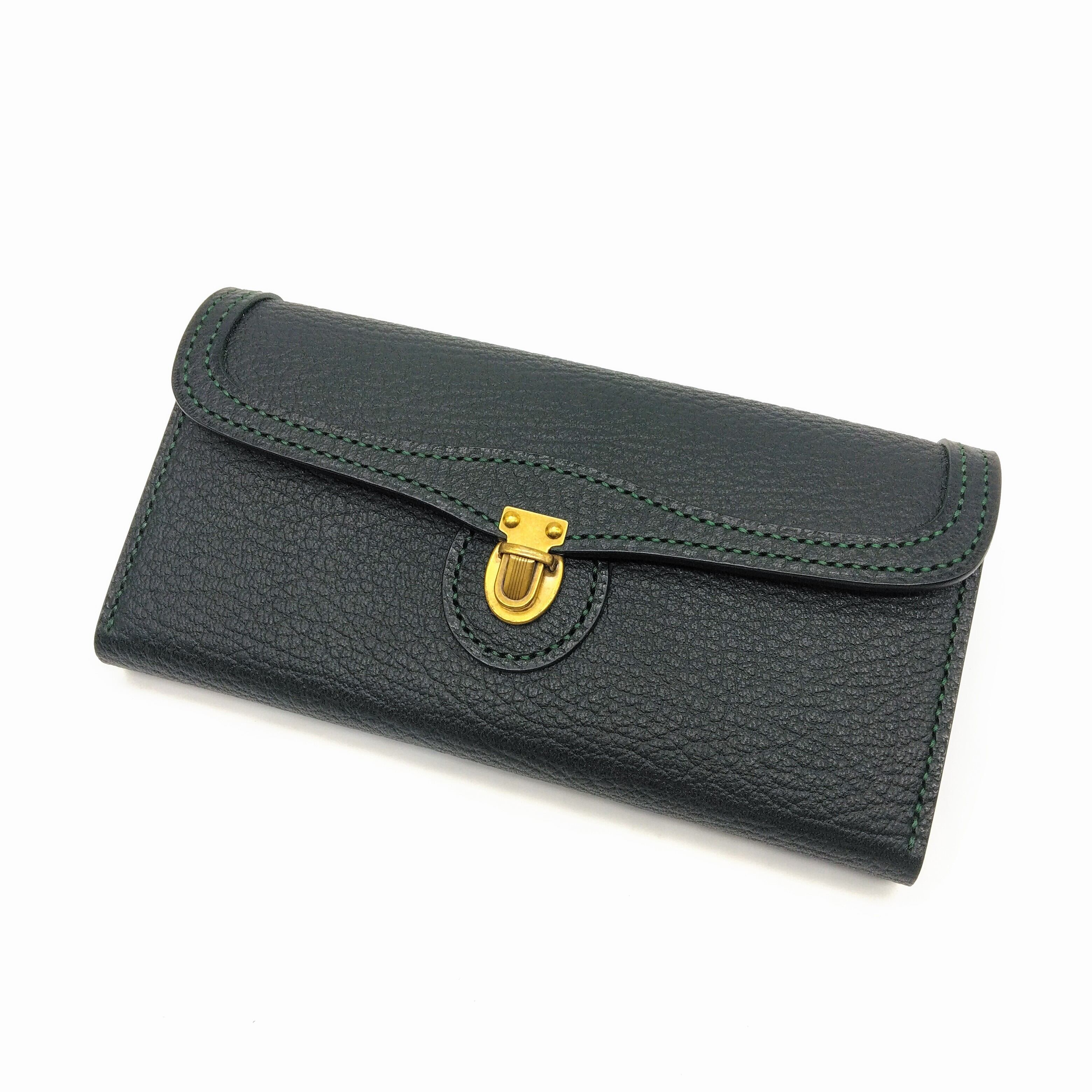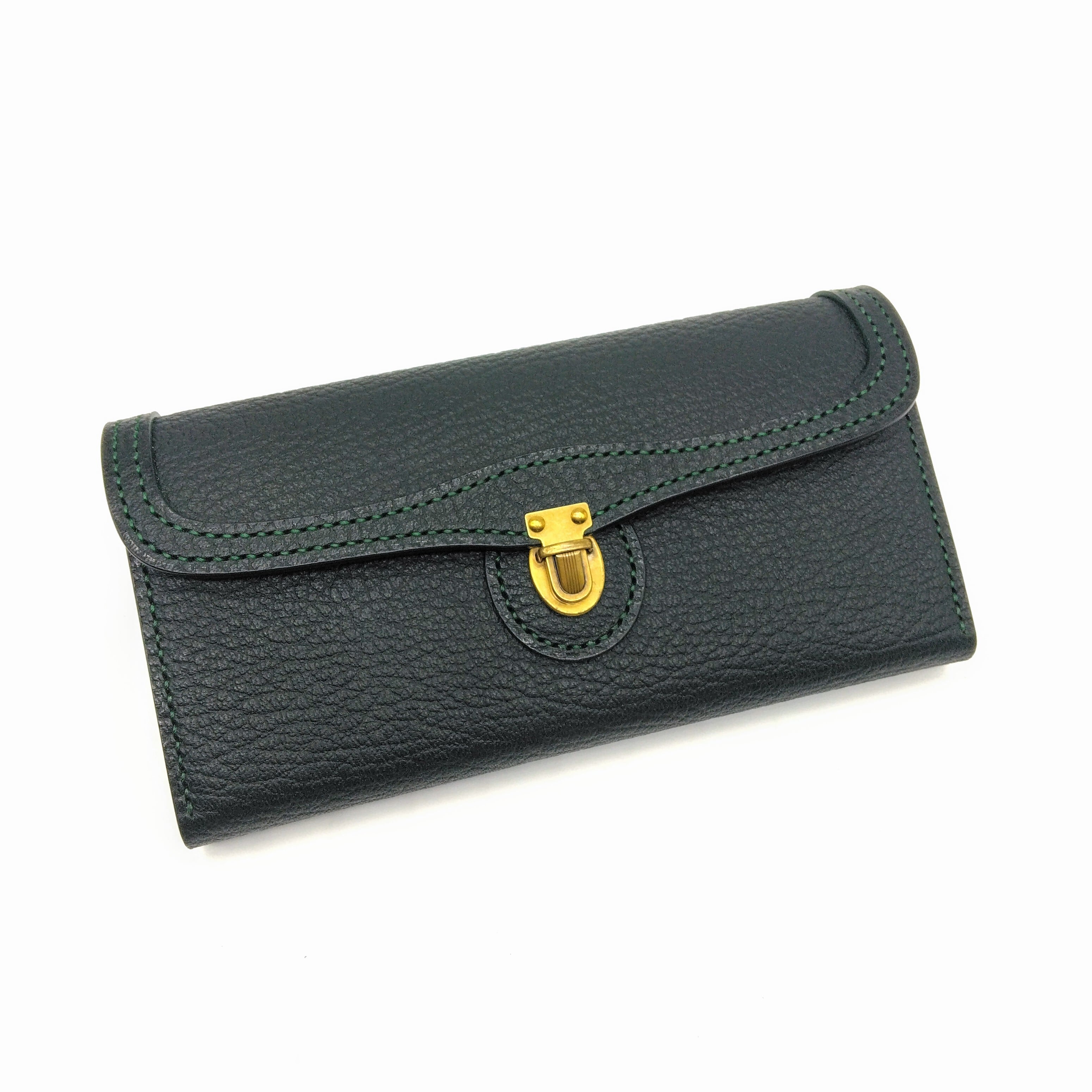 表はイタリア産の深緑のシボ革、内側は国産のこげ茶の革を使い、グリーンステッチで縫っています。