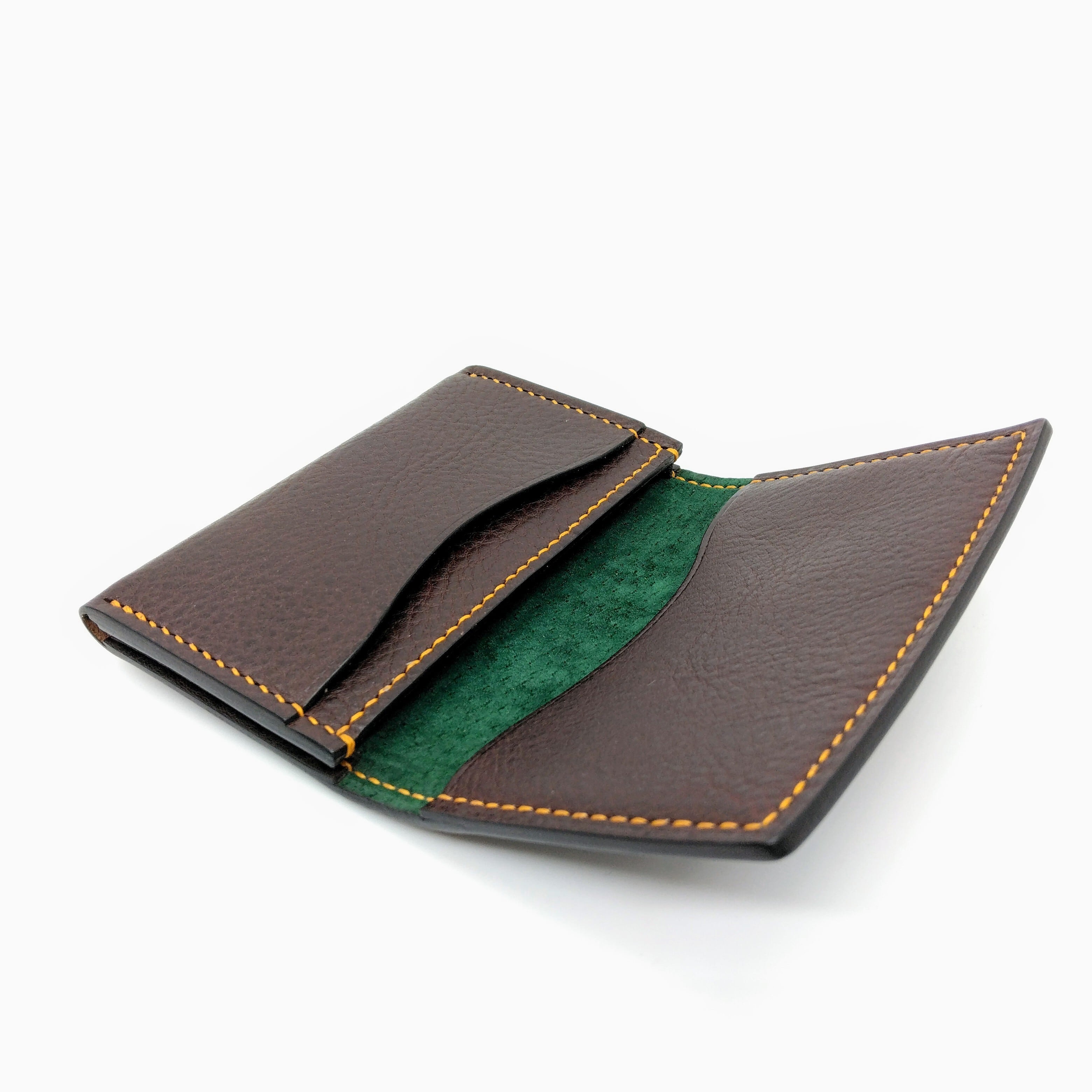 開くとかぶせ部分と本体部分にマチ無しのポケットがあります。すぐに出す分の名刺や頂いた名刺を分けて収納できます。本体マチ無しポケットの下がメインの収納部分になります。メインの収納部分は5㎜程のスペースがあり、名刺を20枚程収納出来ます。
