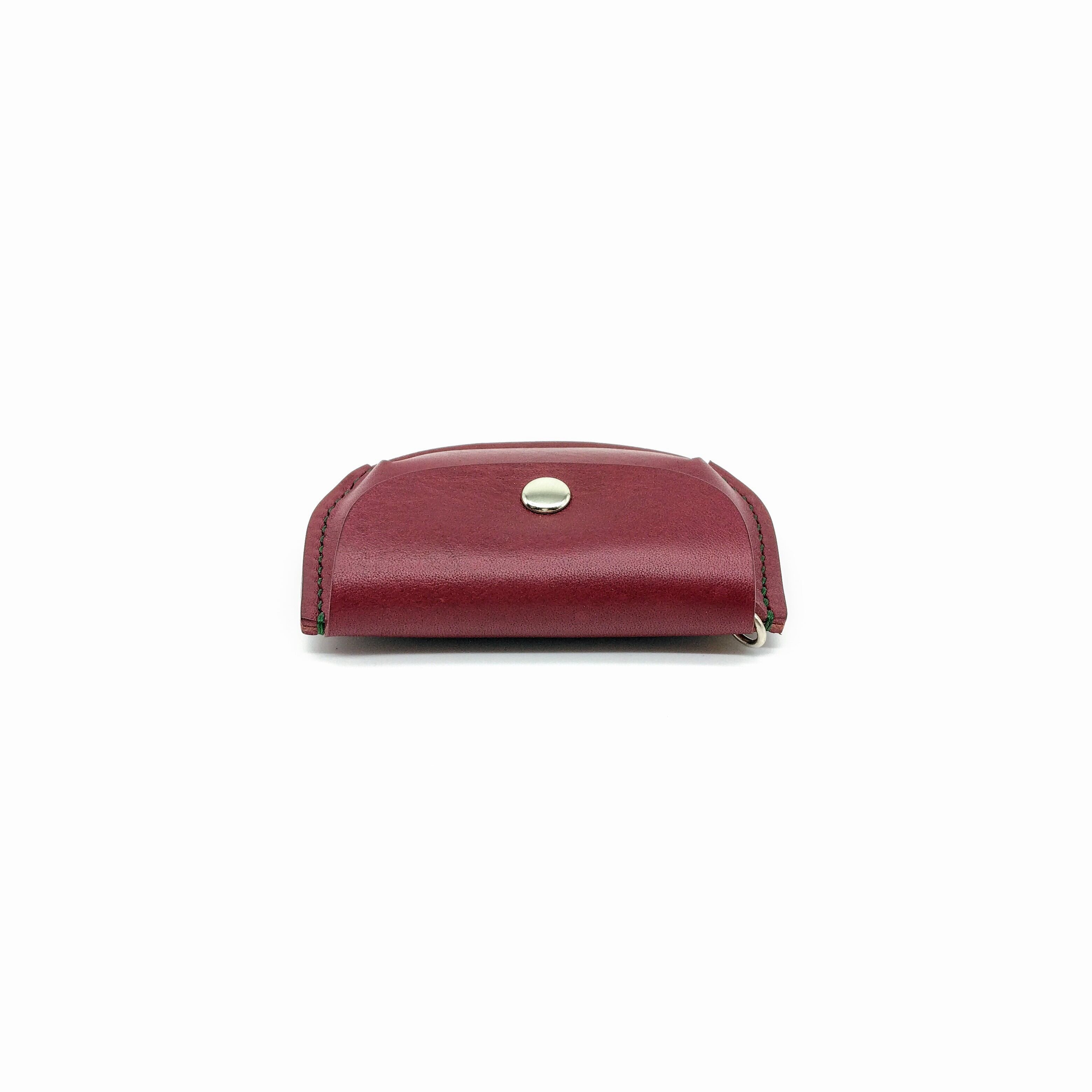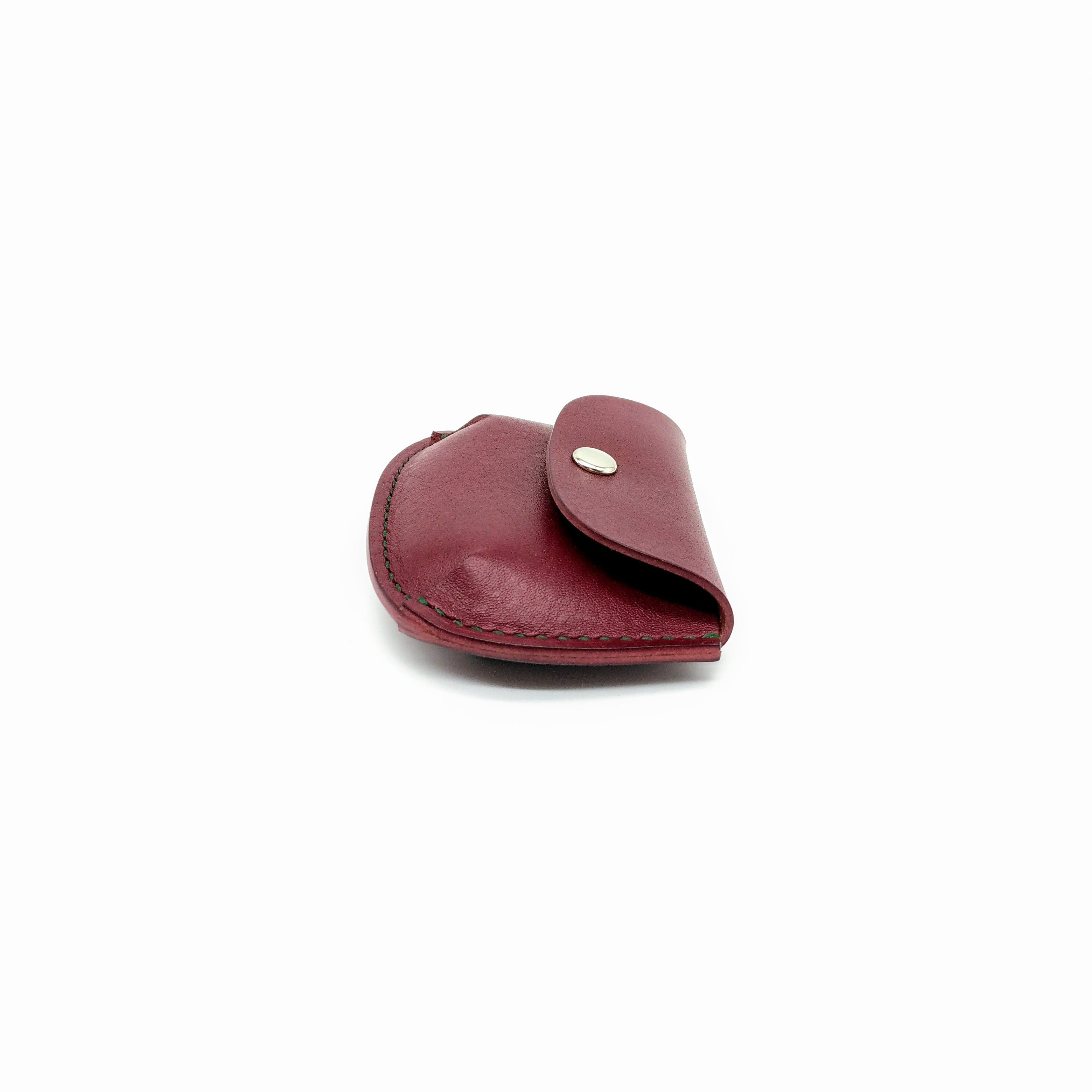 本体の2か所にダーツ(切れ込み)を入れて膨らみをつけて縫っています。マチの無い作りですがぷっくりとした膨らみがあり十分な収納力があります。(500円玉が20枚ほど入ります。)