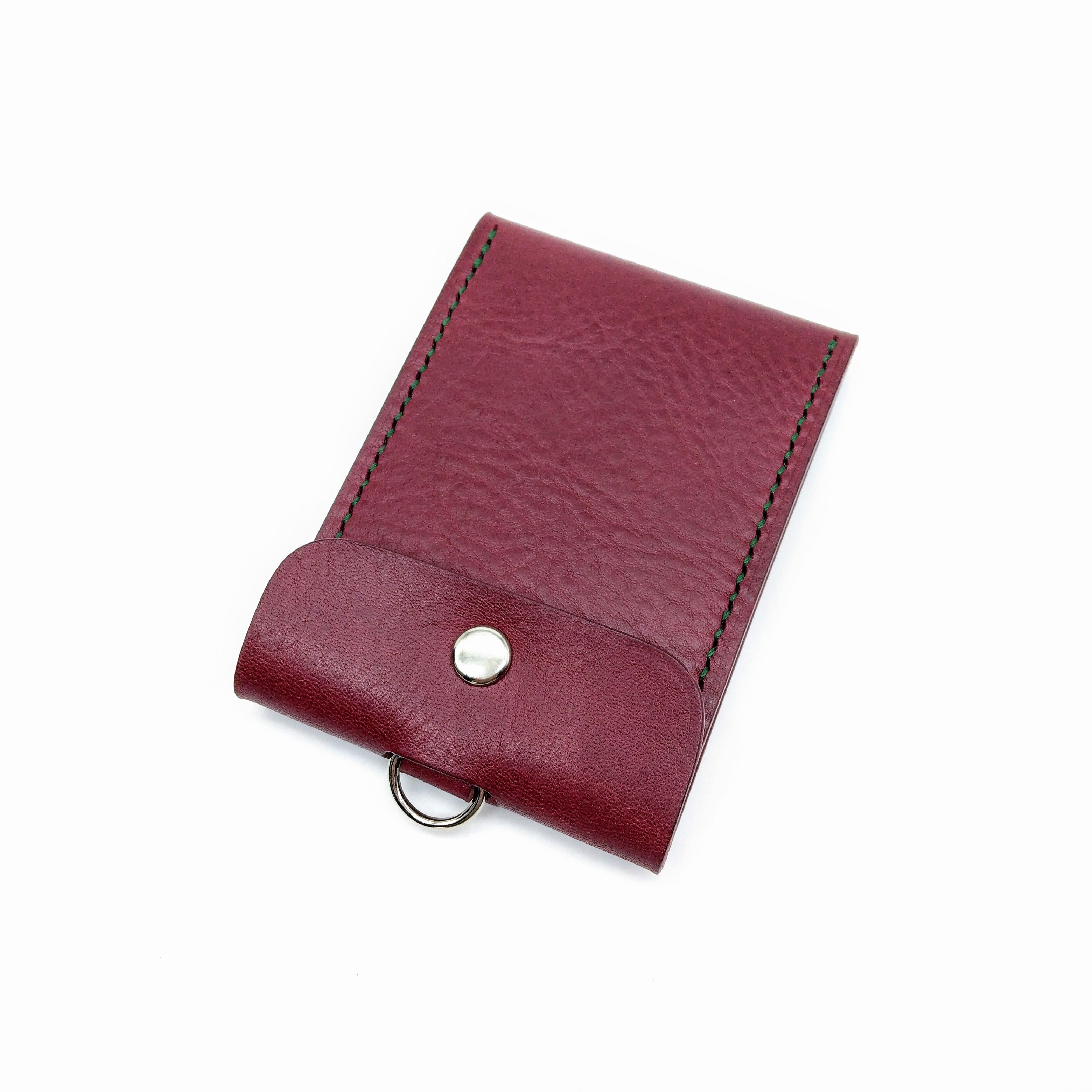 上部にはDカンが付いています。かぶせ部分の穴にDカンを通すようにしてかぶせを閉じて、ストラップやネックストラップなどで吊して使うと、開いてしまうことがなく中のカードが落ちない設計になっています。