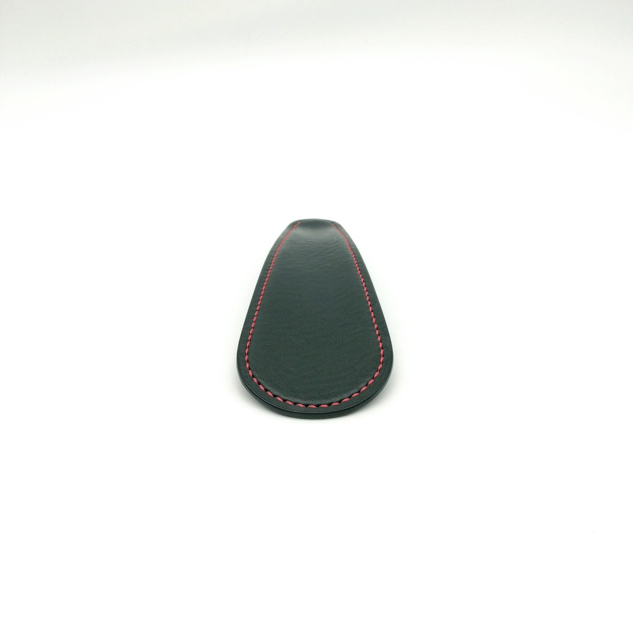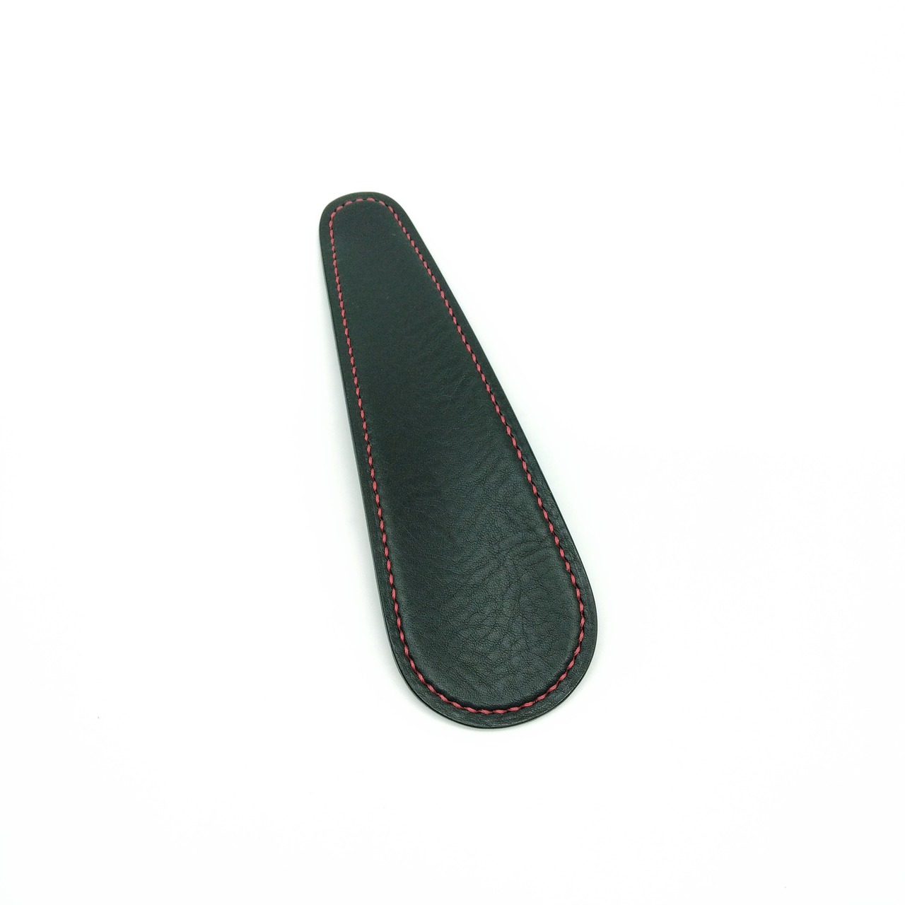 金属製の靴べらを革ではさんで縫っているので、型崩れせずしっかりこの形を維持したまま使えます