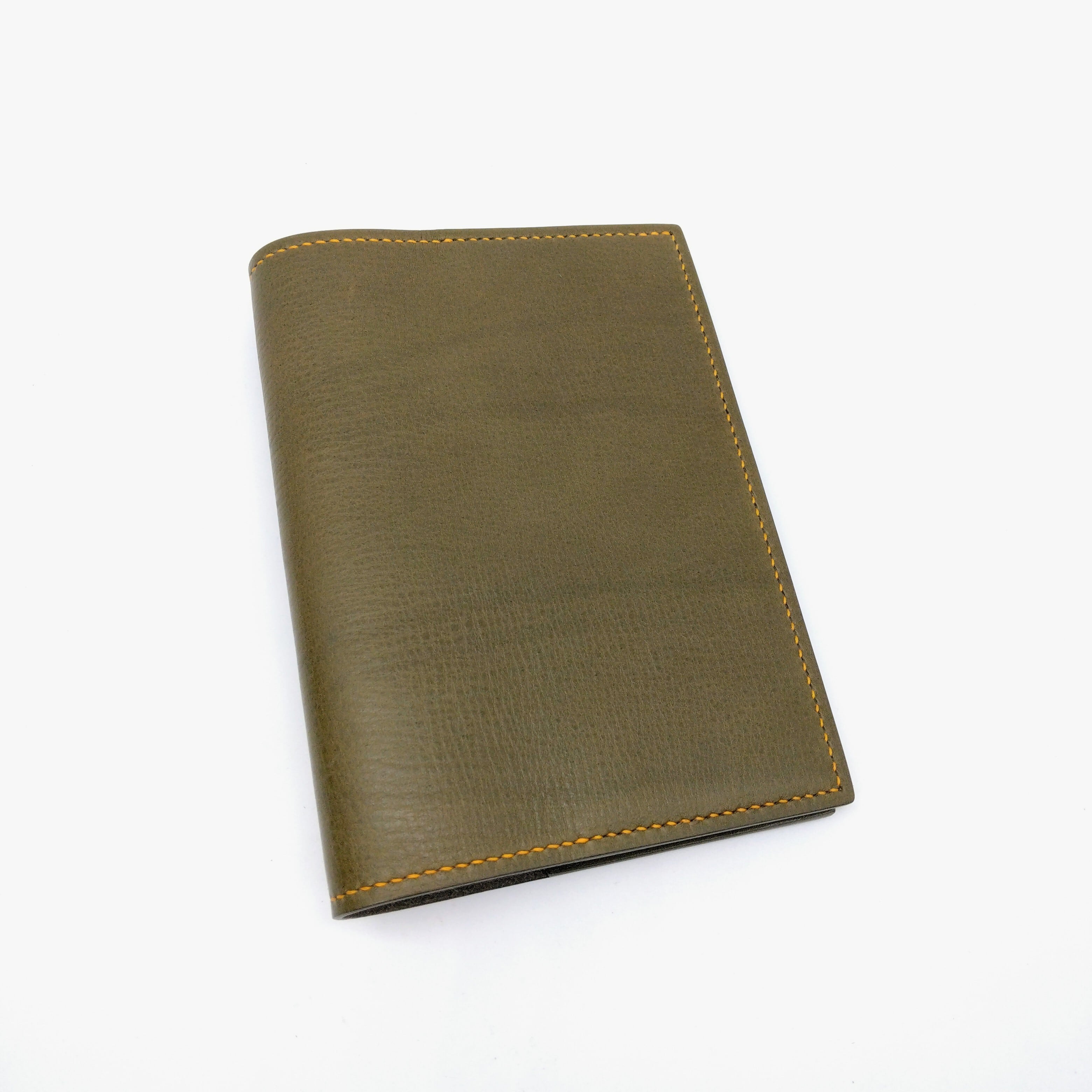 オリーブグリーンのシボ革にイエローステッチを合わせて優しい雰囲気のブックカバーです。