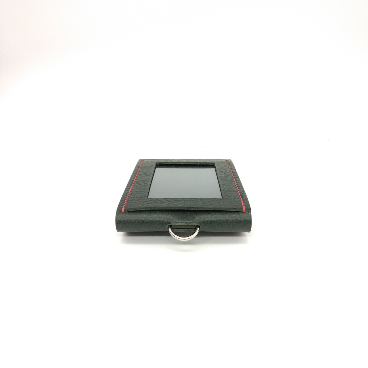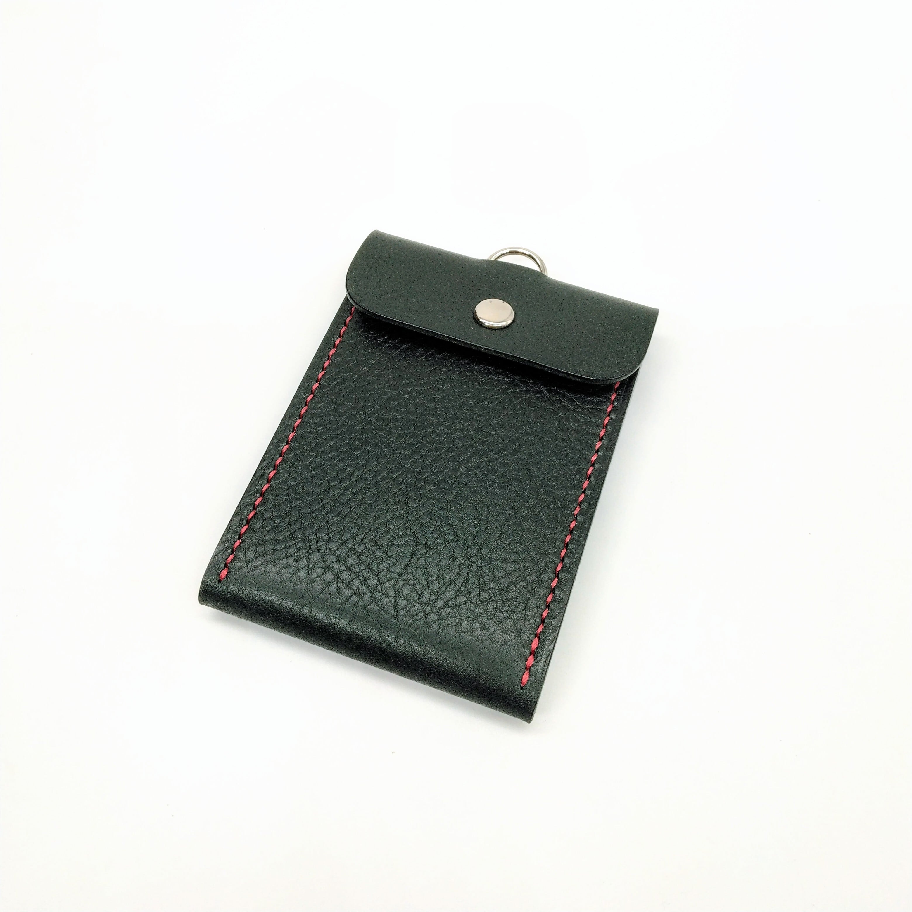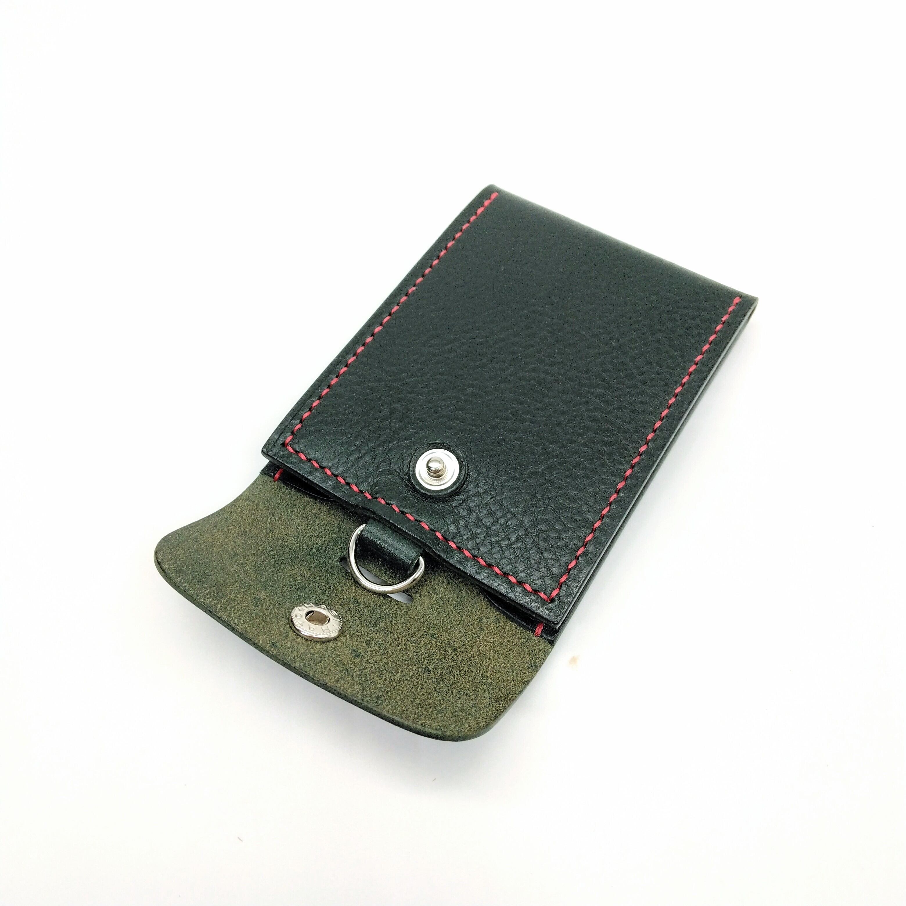 上部にはDカンが付いています。かぶせ部分の穴にDカンを通すようにしてかぶせを閉じて、ストラップやネックストラップなどで吊して使うと、開いてしまうことがなく中のカードが落ちない設計になっています。
