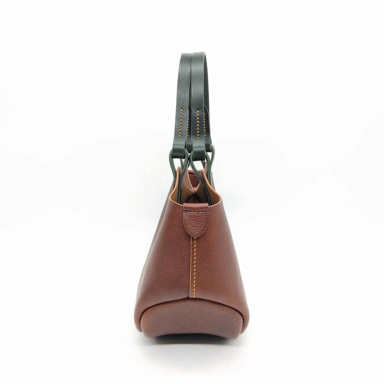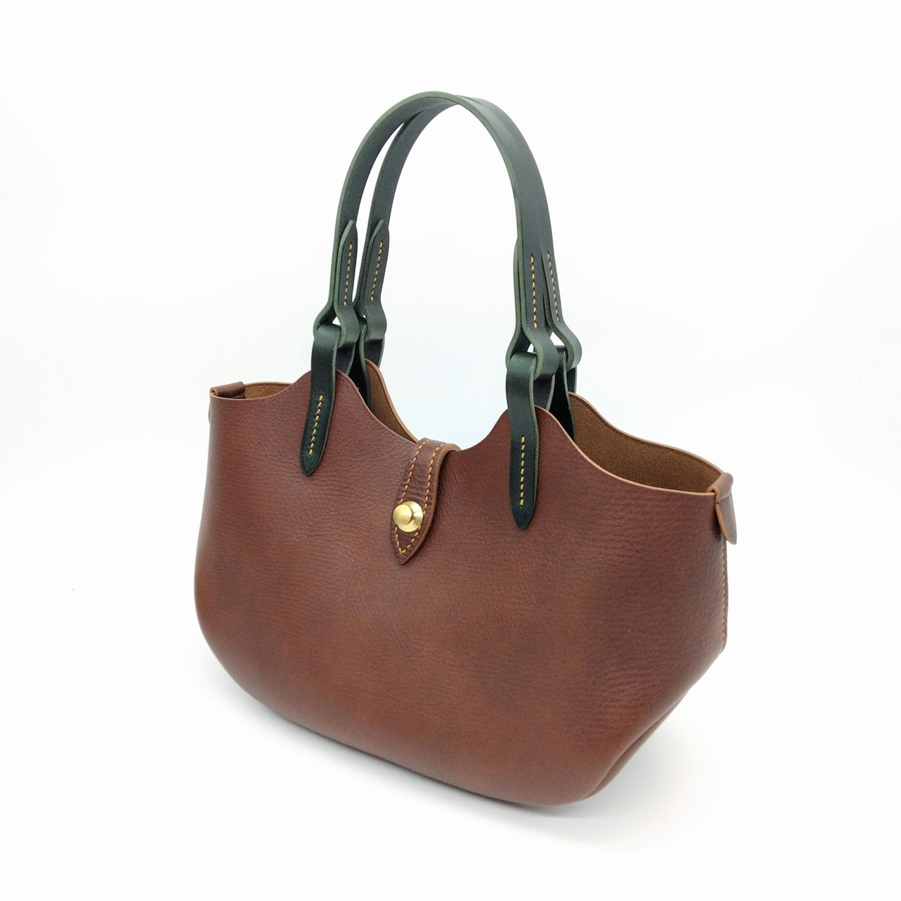 細い持ち手とコロンとした形が特徴の小ぶりなトートバッグです。