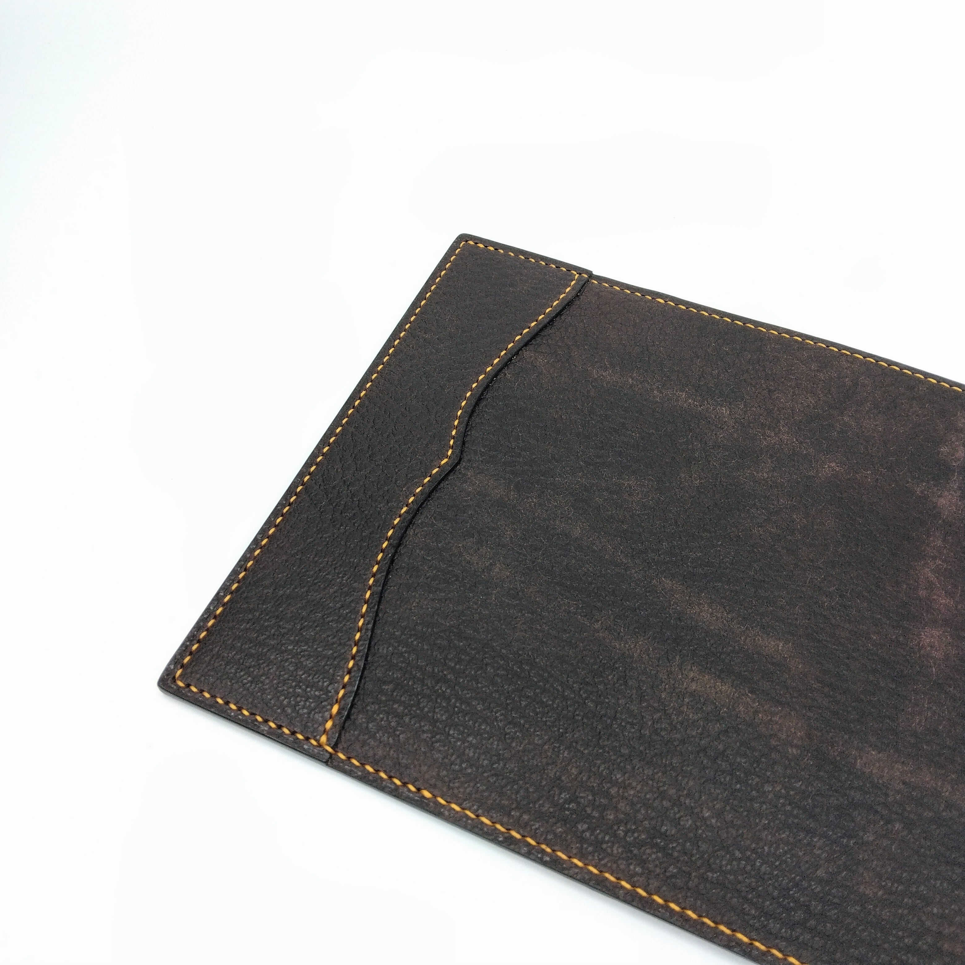 イタリアのトスカーナ地方、植物タンニン鞣しの生誕地と言われるサンタクローチェ地区にあるタンナーが製造するタンニン鞣しのオイルレザーです。表面はスクラッチ加工が施されており、ややざらついたマットな手触りとムラ感のある深い色合いが特長の革です。表面のシボは日本国内でつけたシボで、上品かつダイナミックな表情を楽しめます。オイルを十分に含んだ革で使用しているうち美しい艶とより深みのある色合いに経年変化していきます。