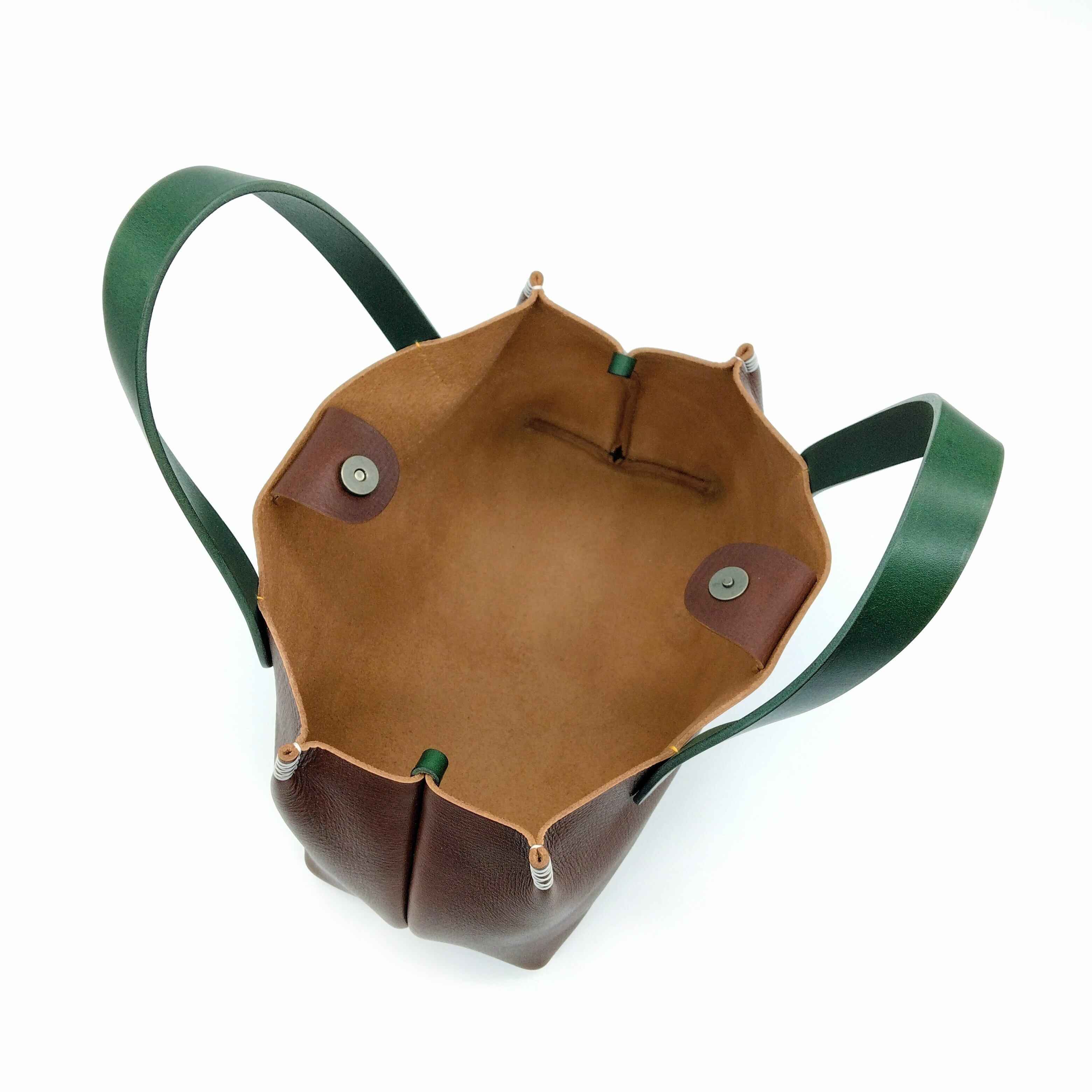 口の部分の四隅をつまんで縢って四角い形にしています。四隅のクロスステッチと持ち手部分の縦に入ったステッチがアクセントになっています。