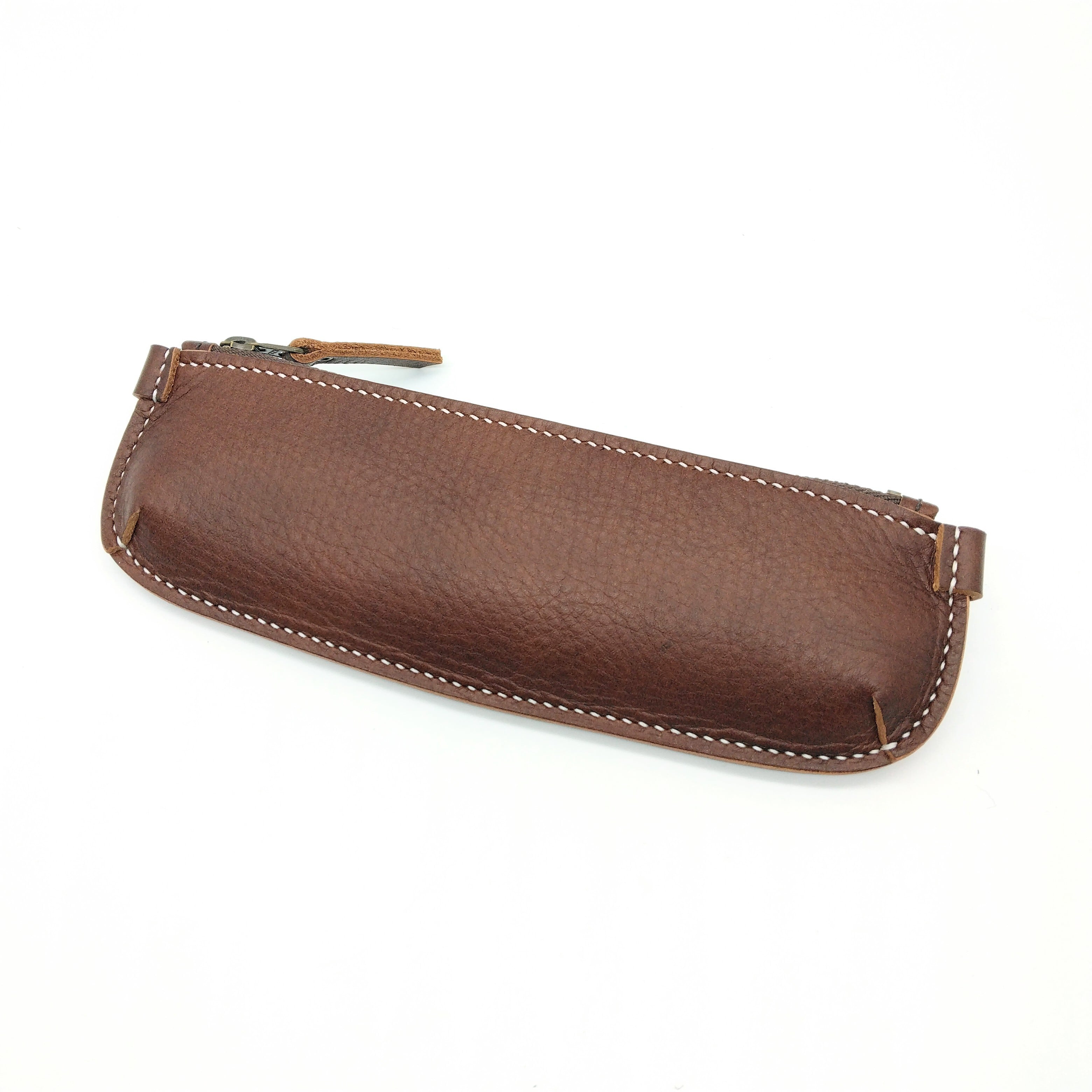 程よい弾力のある国産のオイルレザーを使用しています。表面のシボは当工房で手揉み(四方八方から革を手で揉みほぐしてシボをつけるやり方)でつけたシボでナチュラルな表情を楽しめます。経年変化の速度はゆっくりですが、使っているうちに徐々に美しい艶感とより深みのある色合いに経年変化していきます。